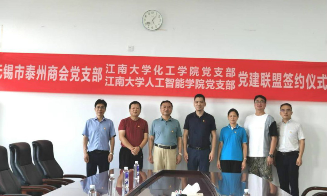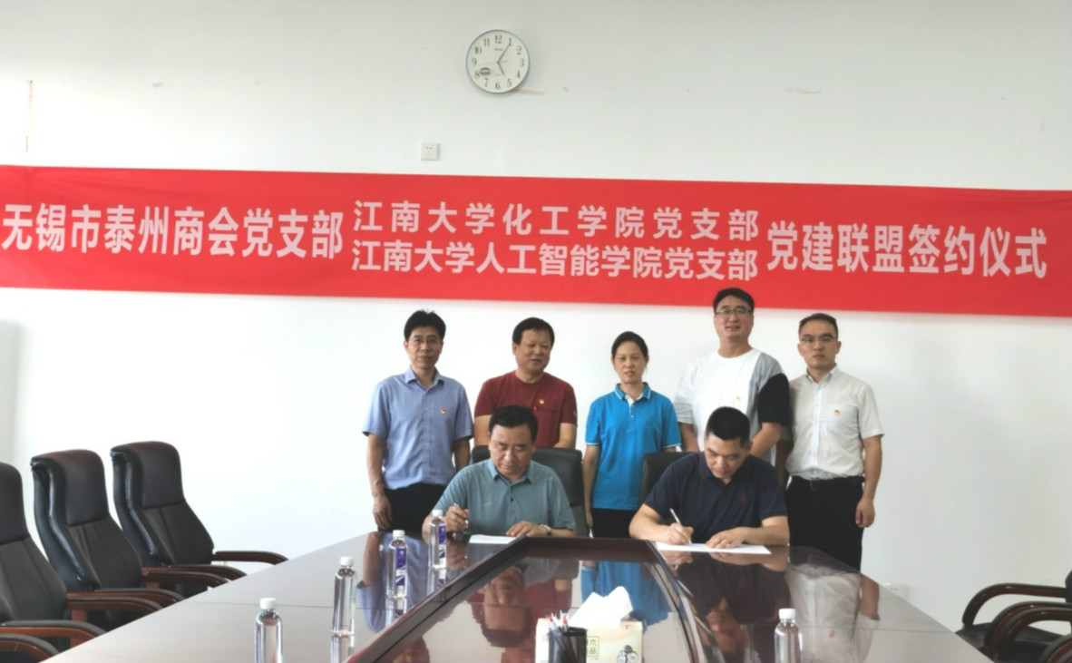 为了深入贯彻落实习近平新时代中国特色社会主义思想和党的十九大精神,全面推进党组织建设,搭建共建合作平台,形成“共建组织、共抓队伍、共享资源、共谋发展”的党建工作的新格局,8月19日下午,江南大学龙8-long8(头号玩家)国际唯一官方网站党委与无锡市泰州商会党支部签订了党建共建协议书。龙8-long8(头号玩家)国际唯一官方网站党委书记张华、副书记陈祎,无锡市泰州商会党支部书记周庄其、副书记王南斌、组织委员张为民、学习委员高军、党建指导员徐曜出席签约仪式。