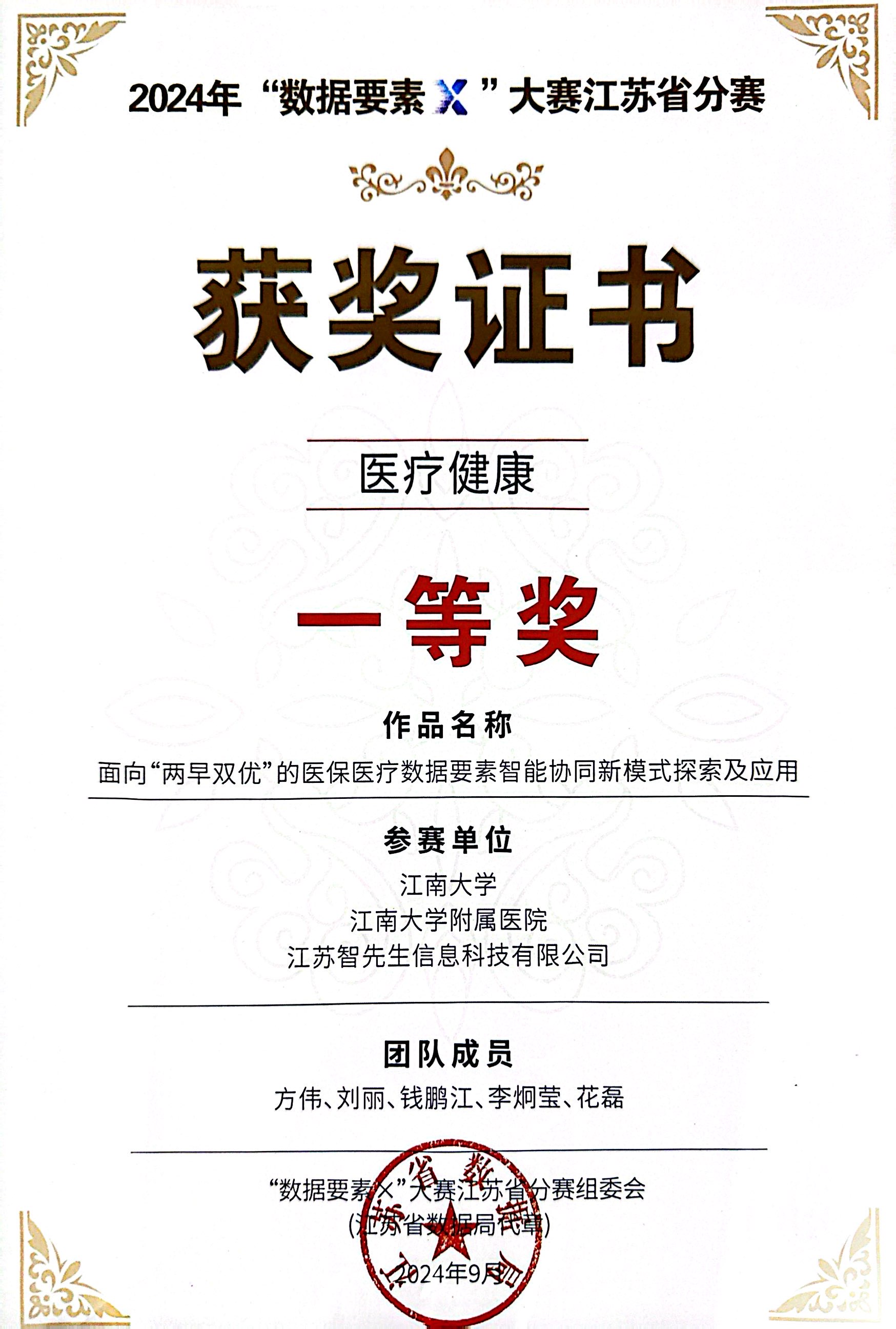 10月18日,由江南大学龙8-long8(头号玩家)国际唯一官方网站、江南大学附属医院与江苏智先生信息科技有限公司联合组成的创新团队(简称江大创新团队,成员包括方伟、刘丽、钱鹏江、李炯莹、花磊等),在江苏省数据局举办的2024年“数据要素X”大赛江苏省分赛中以卓越的表现脱颖而出,荣获一等奖。江大创新团队提出的面向“两早双优”的医保医疗数据要素智能协同新模式,获得了评委们的高度认可和一致好评。
