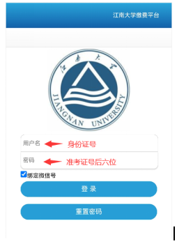用户名为身份号,初始密码为准考证上的考生编号后6位(请考生下载准考证,准考证打印系统网址:http://yzgmis.jiangnan.edu.cn/zsgl/bswb/login.aspx