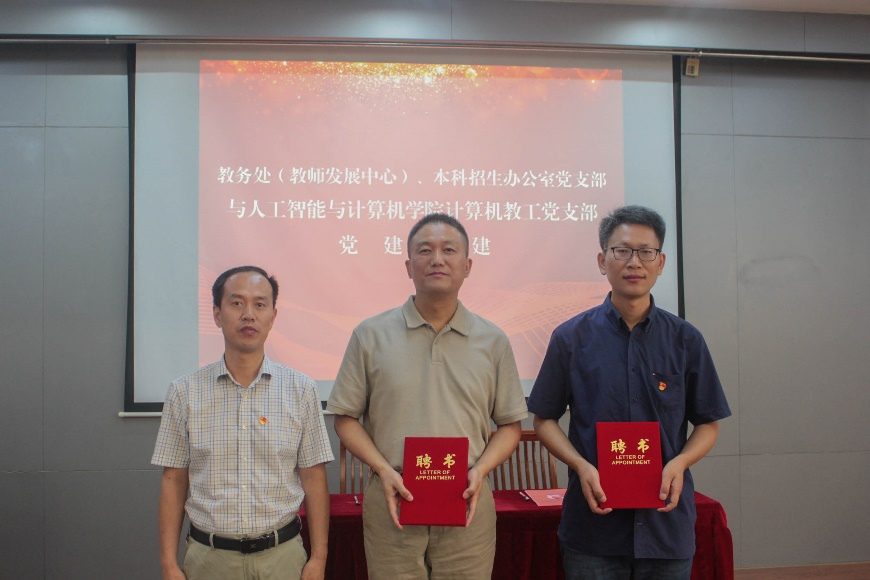 签约仪式结束后,还举行了教学观察员聘任仪式,聘任夏鸿斌、毛力、蒋敏、杨金龙为教学观察员,并由教务处副处长吴宝锁向四位老师颁发聘书。本次活动还邀请了人文学院陈明选教授为两个支部的党员开展了一次主题教育联学党课。