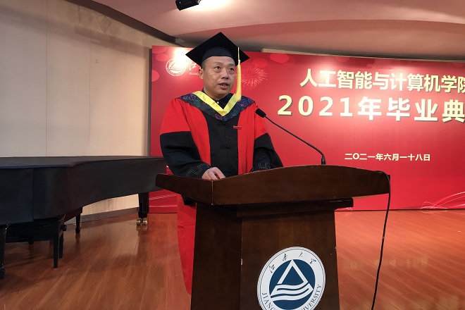 伴随着庄严的国歌,典礼拉开帷幕。院长刘渊首先致辞,他对毕业生提出三点期望:第一要守住初心,保持本真,夯实人生的厚度;第二要学无止境,追逐理想,提升人生的高度;第三要修德励能,勇担使命,拓展人生的宽度。同时,他期待毕业生能够在青春中绽放最美的年华,走向更加辉煌的崭新时代。2017级本科生陈颖作为毕业生代表进行发言。她通过回顾自己在母校的四载时光,表达了母校的眷恋和对老师的感激之情。随后,毕业生代表向教师代表鲜花,感谢老师们在四年时光中所付出的努力与汗水。教师代表邓赵红通过讲述自己在江南大学工作的故事,启迪毕业生在未来的激烈竞争中保持韧性,不忘初心,砥砺前行。学院党委书记张华宣读校友联络员名单并颁发聘书,他希望毕业生无论走到哪里,走得多远,都铭记自己启航出的地方。