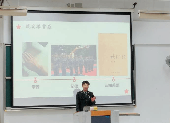 分享中,金家立介绍了自己的从军初心,讲述了自己从一名江南学子到警卫战士的转变的精彩故事。退伍后,金家立秉承着“苦练铸精兵,退伍不褪色”的信念,在学业、体育等各方面仍不断提高和完善自己,力求德智体美全面发展,积极参与学校组织的国防教育和征兵宣传,用自己的独特经历激发2022级新生的爱国之情、报国之志。