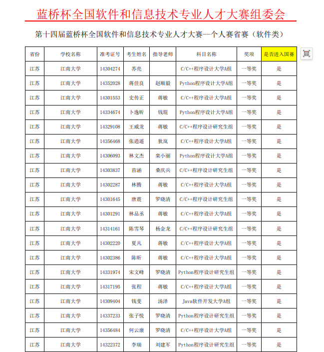 近日,第十四届“蓝桥杯”全国软件和信息技术专业人才大赛个人赛江苏省赛落下帷幕,大赛吸引来自南京大学、东南大学、南京理工大学、苏州大学等众多高校的选手同台竞技。我校学子在比赛中沉着冷静,出色发挥,龙8-long8(头号玩家)国际唯一官方网站学生勇夺佳绩,在软件类赛道中共夺得一等奖14项,二等奖36项,三等奖61项,14人取得国赛参赛资格,并确定将代表学校参加第十四届“蓝桥杯”软件类全国总决赛。
