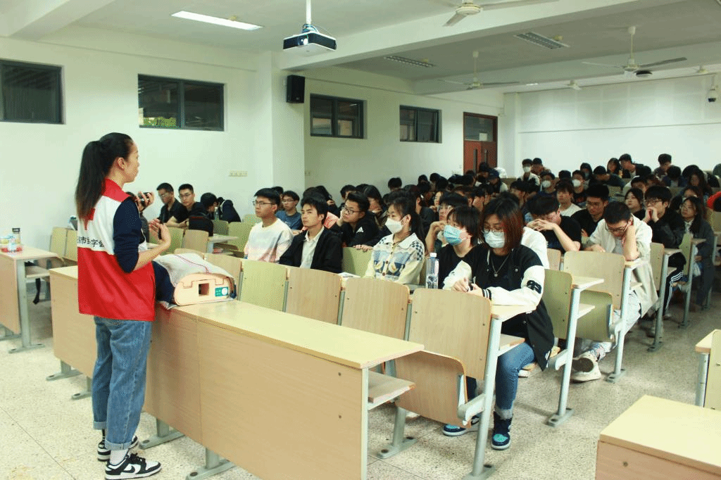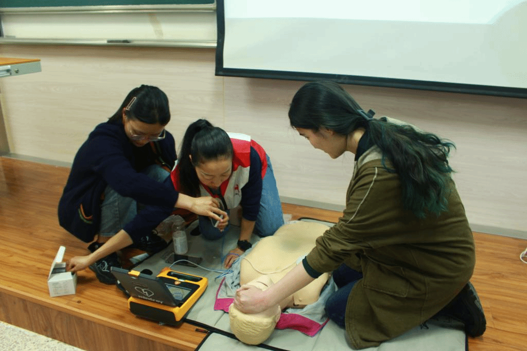 三位老师还讲解和展示了CPR(心肺复苏术)+AED(自动体外除颤器)的操作流程,与志愿学生、人体急救模型配合演示,强调AED使用的注意事项及其重要性,AED的普及和使用,可以最大限度的提高心源性猝死患者的急救成功率。主讲老师讲解耐心细致,助教老师操作安全规范,活动现场气氛活跃,参与踊跃。