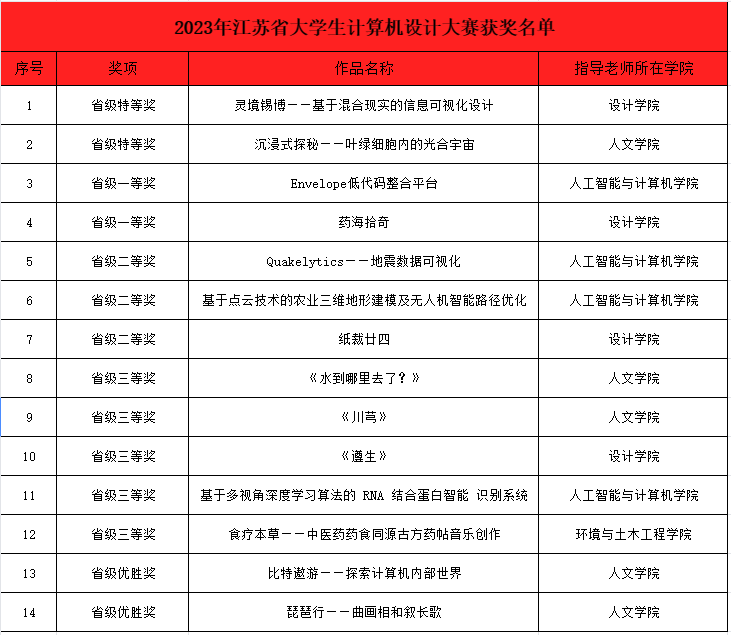 近日,2023年江苏省大学生计算机设计大赛决赛成功举办。经过为期两天激烈的角逐,我校共获得特等奖2项、一等奖2项、 二等奖 3项、 三等奖5项、优胜奖2项,三名指导教师获评优秀指导老师,江南大学荣获优秀组织奖。