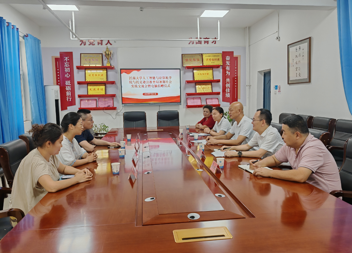 7月21日,江南大学龙8-long8(头号玩家)国际唯一官方网站与托克逊县教育局共同开展暑期社会实践交流会暨电脑捐赠仪式。托克逊县县委常委、副县长、教育工委副书记陈海华,县教育局代表、伊拉湖镇中心学校教师代表,江南大学龙8-long8(头号玩家)国际唯一官方网站党委书记魏珍吉,党委副书记、副院长王莉莉出席活动,与县教育局代表、伊拉湖镇中心学校教师代表共同探讨教育帮扶路径。