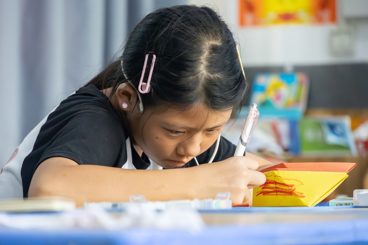 手工课上,彩纸和粘土,画纸与彩笔都成了孩子们的“魔法道具”。折纸时,有的孩子把船帆折得特别大,说“要载着知识漂到山外面”;捏粘土时,有人用棕褐色捏出鼓楼的尖顶,再粘上亮晶晶的碎片当银饰,“这是我们村的鼓楼,AI画过,我也能捏出来”;有人在彩纸上画下和实践团成员一起敲键盘的场景,小人儿们的头顶都冒着代表开心的小圆圈……
