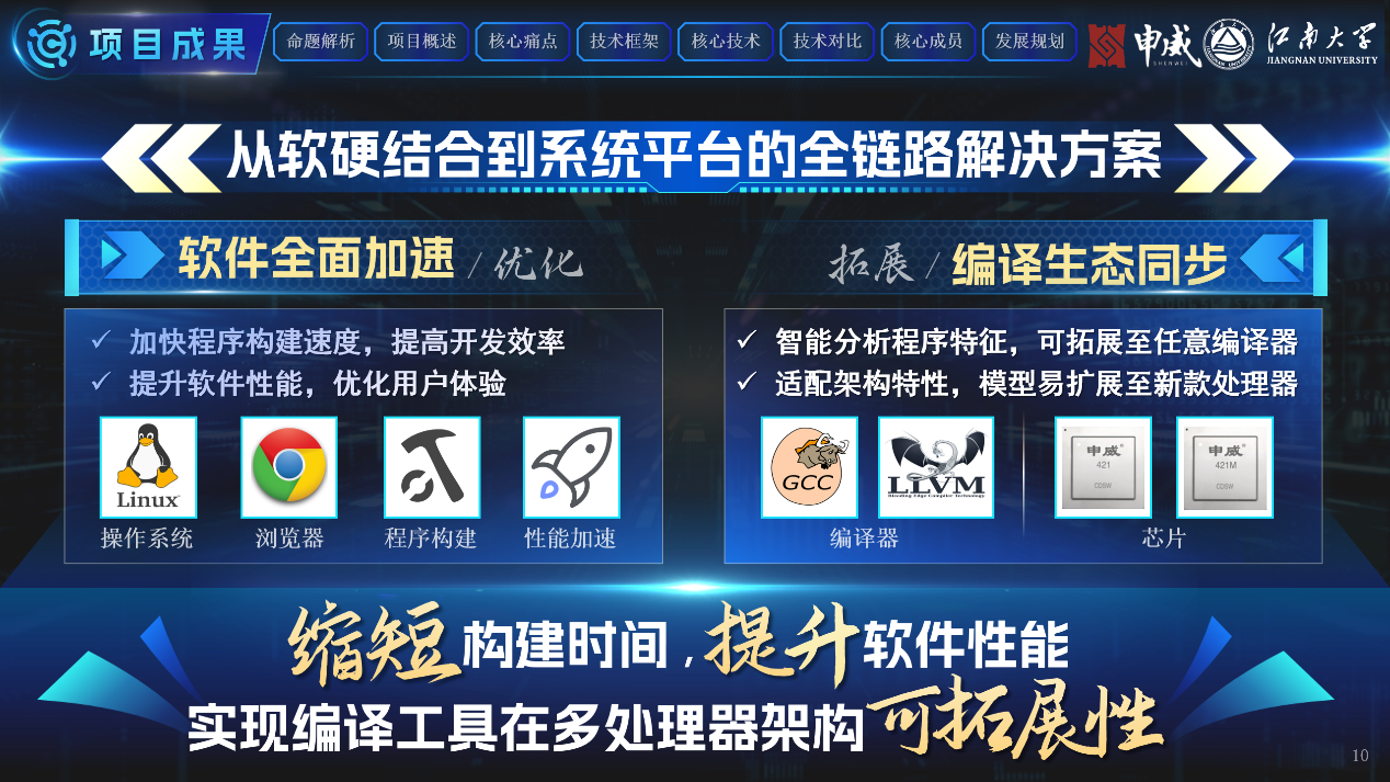 面对传统编译优化启发式规则局限性强、优化组合众多难以选择人工调优低效等行业痛点,团队积极响应“科技自立自强”的时代号召,充分运用人工智能技术构建智能化优化模型,构建了AI驱动的软硬件协同优化智能编译系统,突破了编译优化策略智能生成与编译参数智能调优两大核心技术,在搭载国产WX-H8000处理器的服务器上完成系统性验证,泛化能力强,程序性能得到全面提升。