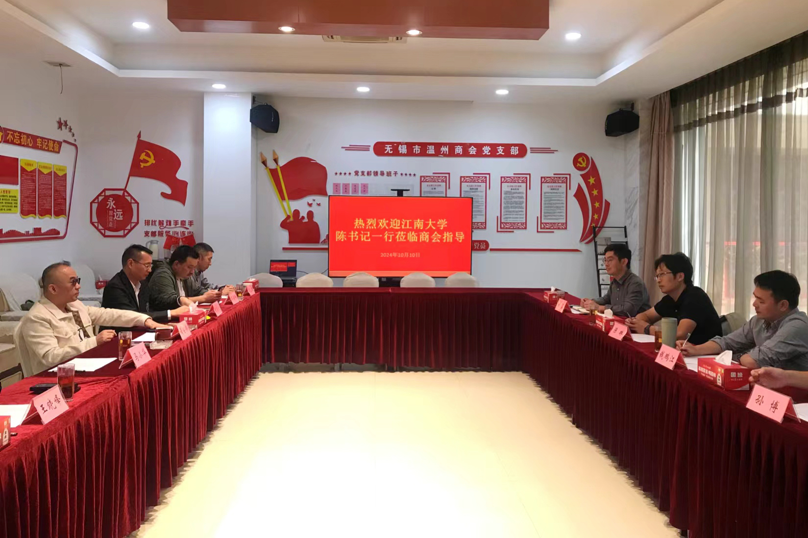 10月10日,龙8-long8(头号玩家)国际唯一官方网站党委书记陈琳、副院长钱鹏江、学工办副主任杜磊,人工智能创新人才培训中心副主任孙博等走访无锡市温州商会。温州商会会长黄会伟,常务副会长马小华、王晓峰、邵海峰等企业家热情接待并参加座谈会。座谈会由商会党支部书记兼秘书长张式义主持。