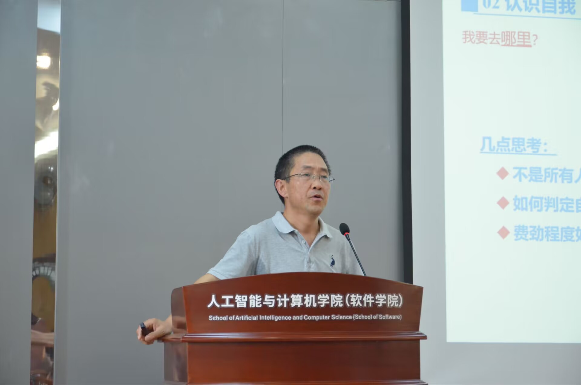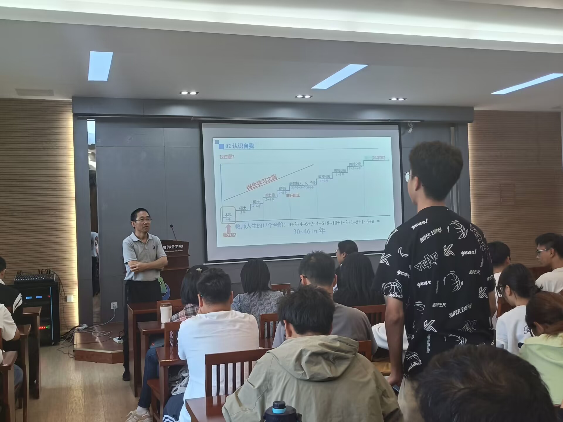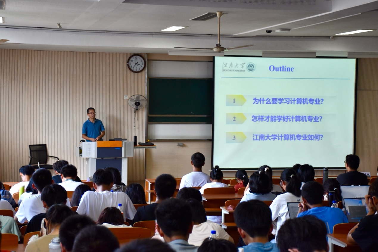 王映辉以自身四十余年从事人工智能领域研究为切入点,重点围绕“认识自我”、“如何做”、“我能去哪里”三个方面为新生进行专题授课。他通过列举二级教授的奋斗历程、人工智能专业优秀学子成长之路等典型案例,教育引导新生明确自身发展定位,科学做好发展规划,平衡好专业课程和科创竞赛之间关系。他希望新生养成良好的学习习惯,努力适应环境变化,苦练专业本领,努力成为祖国人工智能领域的栋梁之才。