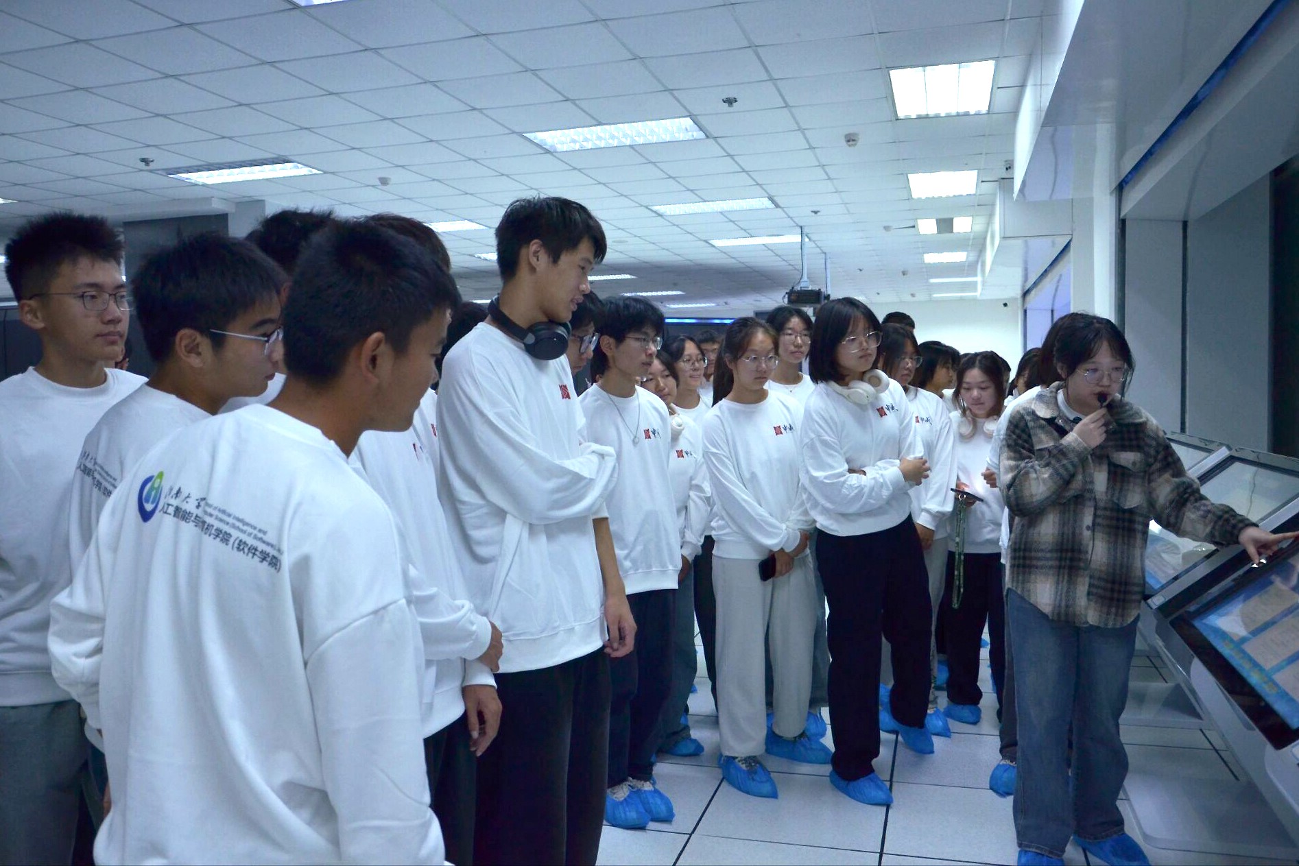 在超算无锡中心,全体同学认真听取了讲解人员对超级计算机性能、应用项目的介绍,深入了解了中国超级计算机三十多年的奋进史。从最初的银河一号、神威一号,到曙光4000A、曙光5000A,再到如今的神威·太湖之光,它们不仅在性能指标上屡创新高,更在应用领域取得了突破性进展。同学们实地参观了由40个运算机柜和8个网络机柜组成的超级计算机,随着机柜的缓缓打开,错综复杂的理论知识变得具象化,更让同学们认识到只有把关键核心技术牢牢掌握在自己手中,才能从根本上保障国家安全。