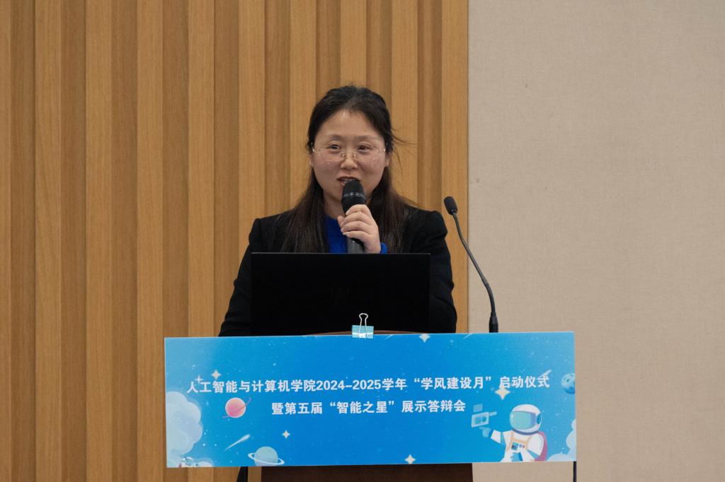 王莉莉回顾了往届智能之星的卓越表现,肯定了在场参与答辩的同学的精彩表现,并表示本次评选不仅是优秀智能学子展现自我的风采盛会,更是树立榜样,辐射全院的交流平台。王莉莉给同学们提出了三点希望:第一,希望同学们能够持之以恒、潜心向学;第二,希望同学们注重创新意识培养、不断突破自我;第三,希望同学们做到志存高远、知行合一。